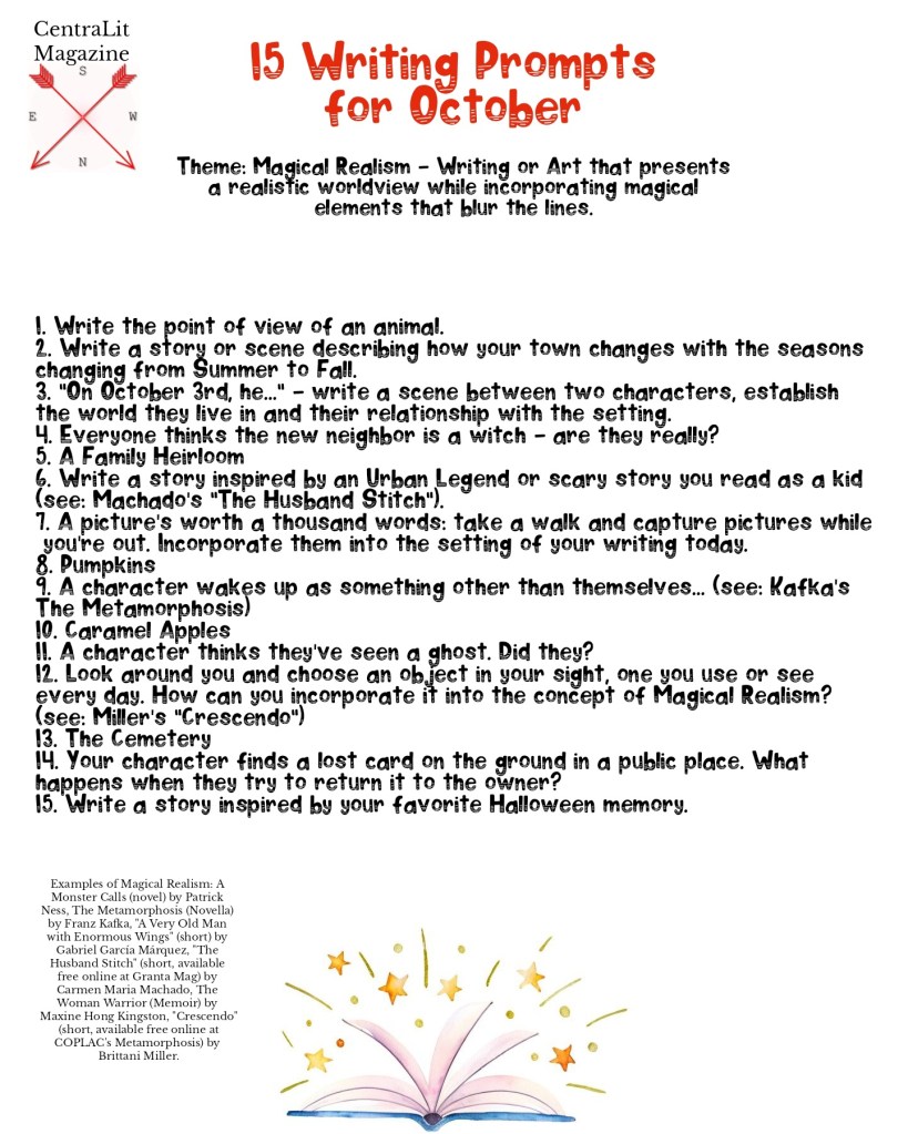 As writers, it is important for us to read, watch, and try out styles that are outside our comfort zone, as it can lend us new tools to create our own work as we learn to bend the rules around genre, style, and craft. Below you will find the 15 prompts for October, as well as examples of Magical Realism at work in published writing.